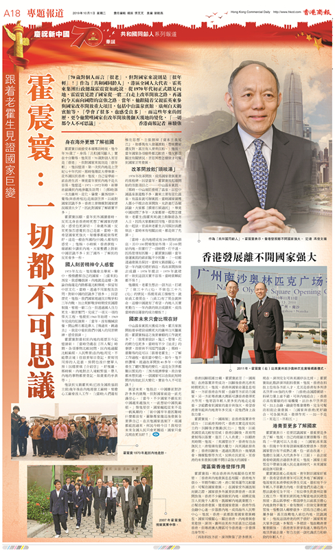 霍震寰日前接受本報專訪時說,他今年70歲了,身為「共和國同齡人」實在十分難得。他笑言,70歲對個人而言是「很老」,但對國家來說則是「很年輕」。他回憶道,第一次到內地是上世紀七十年代初,那時他剛從大學畢業,從外國回到香港。他說,自己留學前一直在港生活,畢竟當年要到內地不是太容易。他憶述,1971、1972年時,新華社組織到內地參觀及訪問:「(那時)第一次去廣州、從化、肇慶、廣西桂林,覺得(與香港相比)是兩個世界,以前對國家認識不多。香港主要傳媒對國家情況報道太少了,因此對國家了解確實不多。」