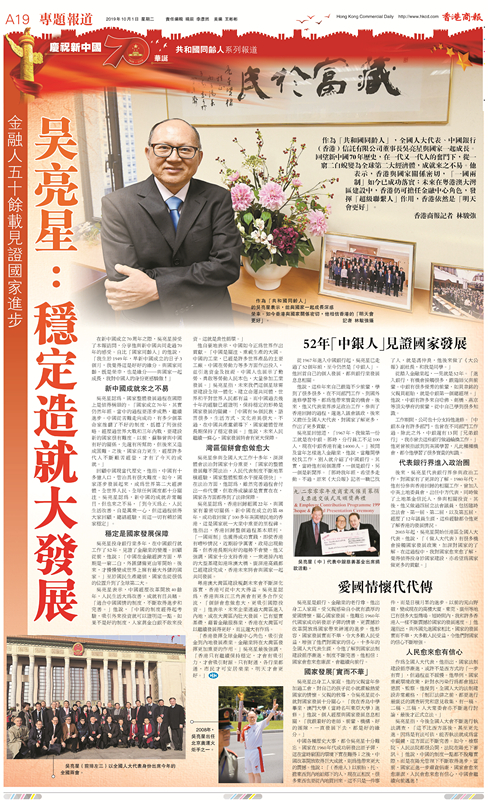 在新中國成立70周年之際,吳亮星接受了本報訪問,分享他與新中國共同走過70年的感受。自比「國家同齡人」的他說,「我生於1949年,早新中國成立的日子3個月,我覺得這是好好的緣分。與國家同齡,既是榮幸,也是緣分——與國家一起成長,我對中國人的身份更感驕傲!」