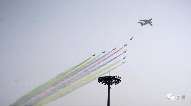 空中护旗梯队拉开了阅兵分列式的序幕,中国共产党党旗、中华人民共和国国旗、中国人民解放军军旗飘扬在天安门广场上空。20架直升机组成巨大的“70”字样。