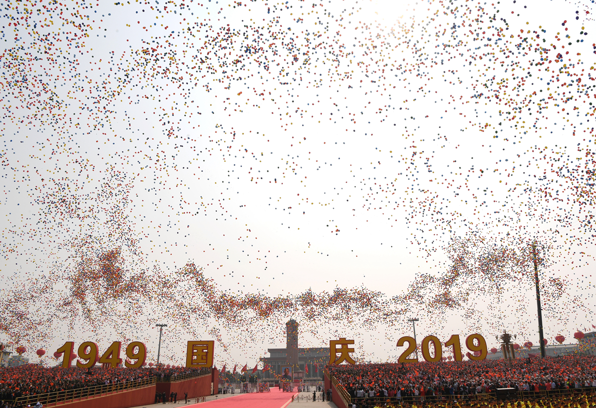 12時40分許,7萬羽和平鴿展翅高飛,7萬隻氣球騰空而起,在《歌唱祖國》的旋律中,歷時2小時40分鐘的慶祝大會結束。