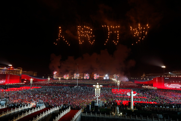張藝謀稱,整場聯歡活動的編排理念是「自由、生動、歡愉、活潑」,充分體現了「人民性」。「我們沒有邀請太多藝術家,大部分演員都是各行各業的普通群眾。他們沒有整齊劃一地歌唱,也沒有身著統一的服裝,而被賦予充分的表演自由:手持發光物,絲巾飛揚、歡歌熱舞、人潮湧動、聲浪沖天、全場沸騰,在天安門廣場『嗨』起來,真切表達幸福感和獲得感。」張藝謀說。