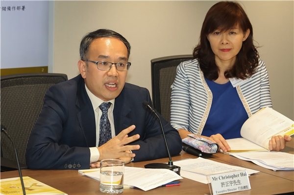 2019年7月,香港金融發展局發表第6份年報,許正宇(左)表示,公司化後的金發局將更具靈活性。中通社