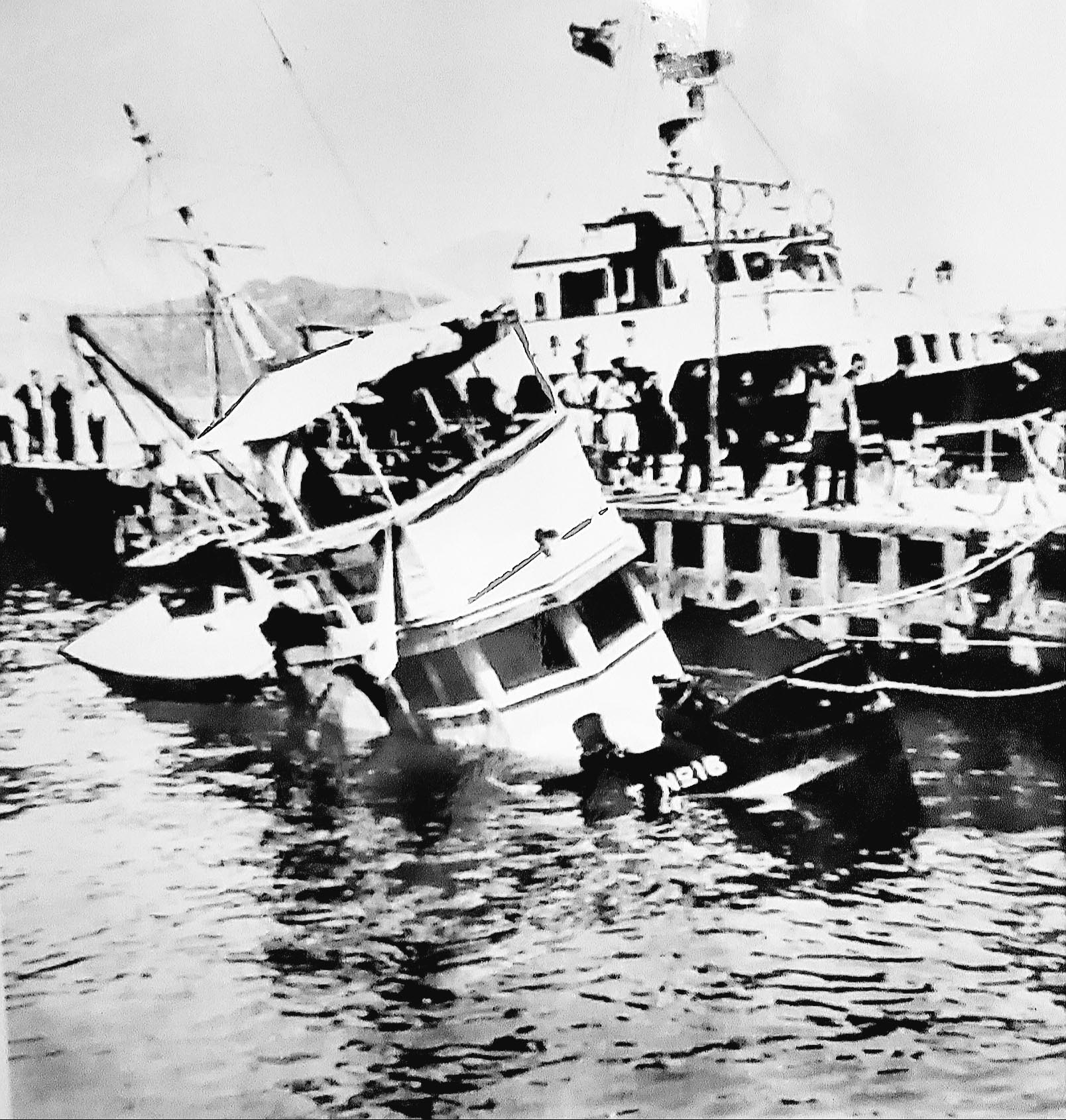 1967 年停泊在長洲碼頭被炸毀的 「熨斗仔」 16號水警輪。