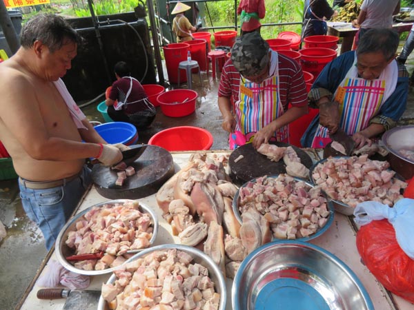 祭祖活動小組召集人傅志堅表示,今年豬肉價格飆升最少好幾成,他們共購入5隻生豬,但價錢比去年6隻還要貴。生豬取上肉及腩肉來燜,大約燜個半小時。傅族專誠聘請人員來製作,單是煮食已有六七人,其他切菜、洗碗等有十多廿人。祖居地的祠堂塌毀多時 (新祠堂今年1月19日重光進伙,位於深井),但煮食的爐灶早已換上新的,4個大爐輪流煮烚,一時間白煙四起。
