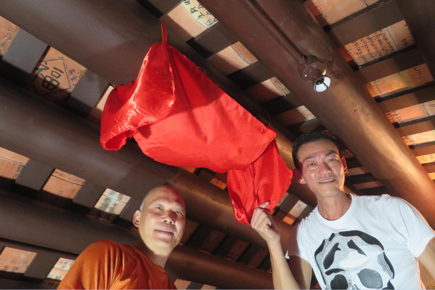 在古廟內進行上樑掛紅並不容易,因為工程正進行得如火如荼,空間被棚架佔據,並搭了半空平台,事實上,新主樑已在個多月前換上,現在等候掛上紅布。溫劉包括記者共3人,須踏上木梯再爬竹棚才能到平台,須步步為營,在狹窄的平台上,兩名村民仔細的用紅繩將紅布綁上主樑,大約3分鐘完成;返到地面後,一名村民即敲響銅鑼通報,按習俗主樑掛了紅布便旺,會吉利安詳。