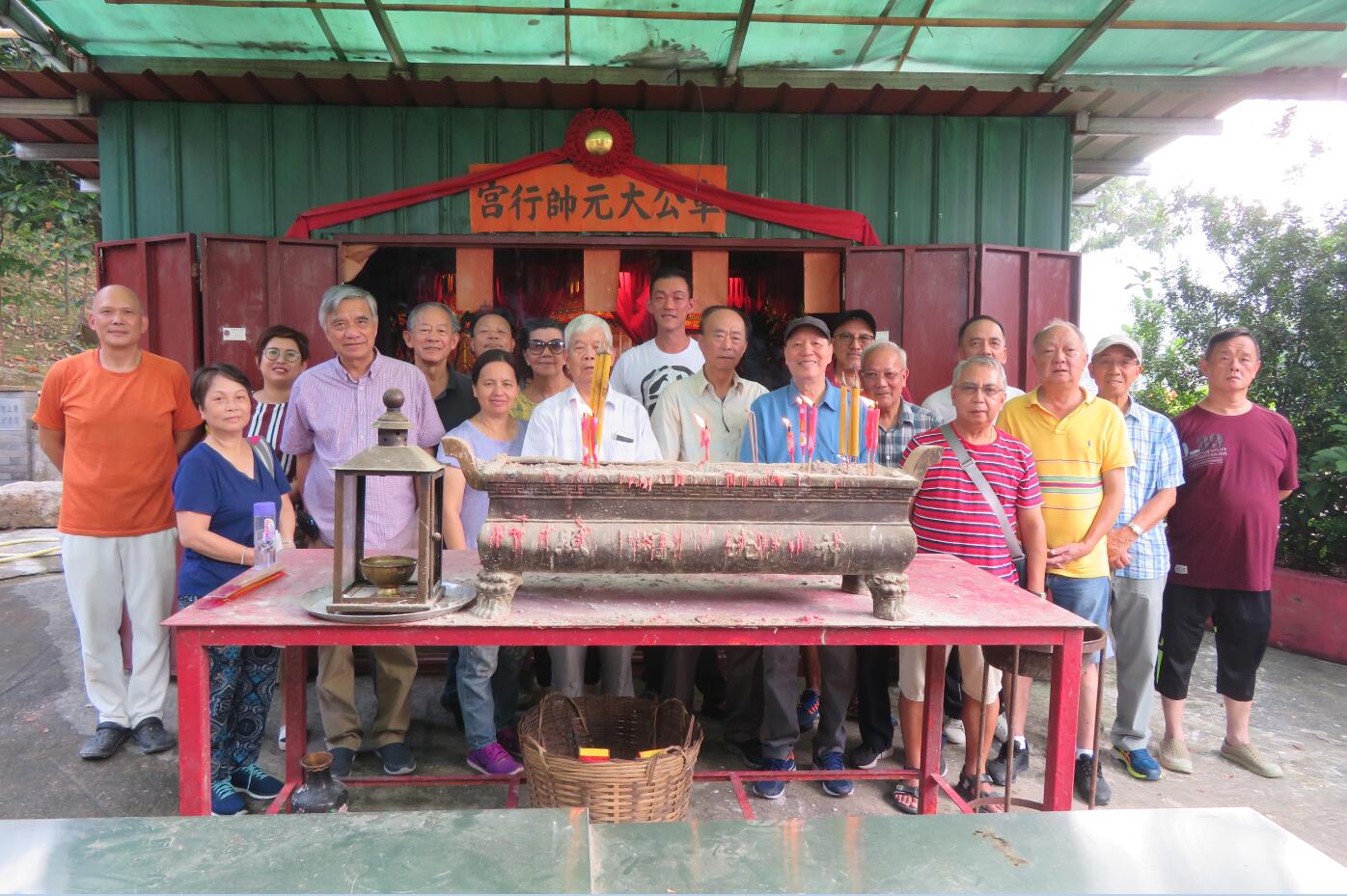 10多名蠔涌村民及善信儀式後在臨時神棚前留影。左四為張土勝。