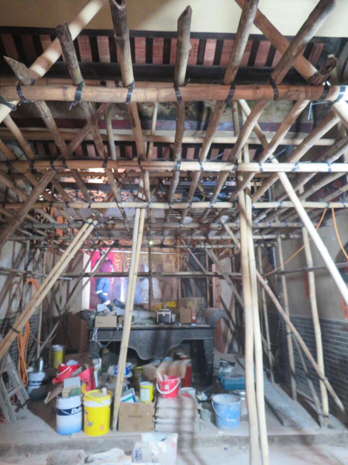 古廟重修如火如荼,搭建了半空竹平台。
