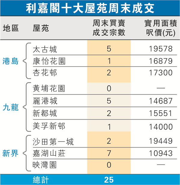綜合利嘉閣地產分行網絡數據,在過去的周末日(10月26日至10月27日)十大指標屋苑錄得25宗二手買賣個案,較對上周末(10月19日至10月20日)的19宗增加6宗或上升32%,創自2017年5月初後的129周(近兩年半)新高。利嘉閣最新十大指標屋苑買賣中,按地區劃分,以新界區最為活躍,累錄9宗成交,港島及九龍區同樣錄得8宗。若以屋苑劃分,以嘉湖山莊表現最佳,兩天內錄得7宗成交。其次為太古城及麗港城,各錄得5宗買賣。
