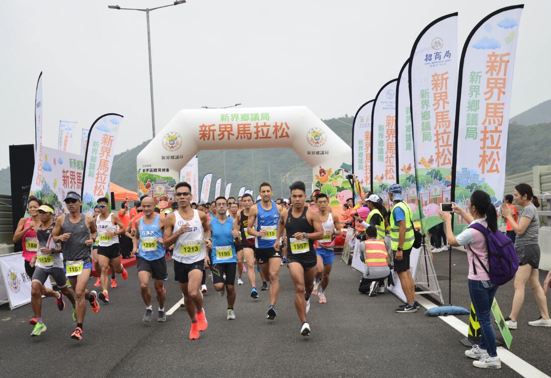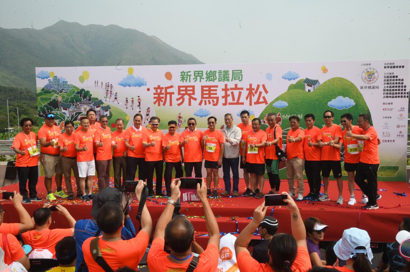 鄉議局主席劉業強在大會致辭指出,該局除了關注新界原居民合法傳統權益和非原居民合理訴求之外,亦積極推廣新界文體康樂事業發展。馬拉松運動源自古希臘時代,今時全球數以萬計人士參與這項群體運動,是次首辦「新界馬拉松」,樂見3000名選手參與,共享和平、友好時光。劉業強與前總務主任委員鍾偉平、新田鄉委會主席文美桂及籌委會局方代表侯榮光分別為1公里家庭、1英里嘉賓個人組比賽發號令笛,而在上午8時,該局總務委員會主任委員侯志強一行為21公里(半馬拉松)發號令笛。