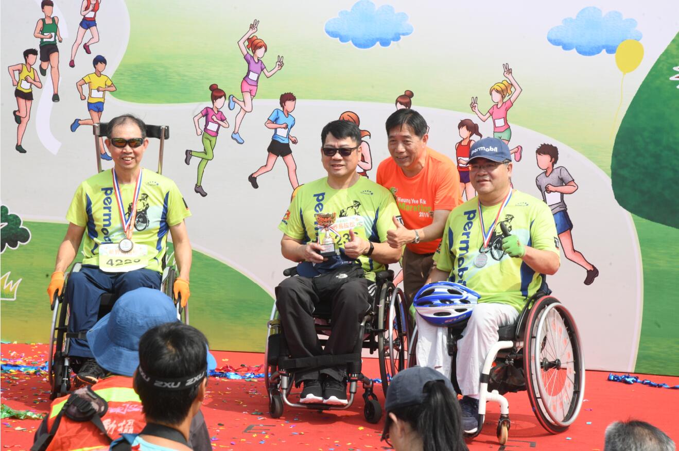 荃灣鄉委會主席邱錦平(紅衫者)向香港傷殘青年輪椅隊頒獎後合影留念。