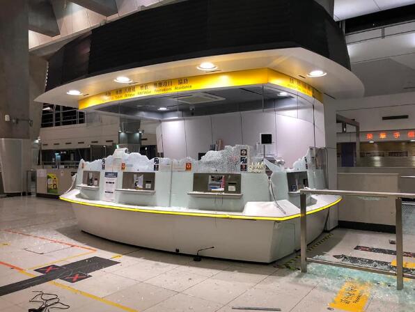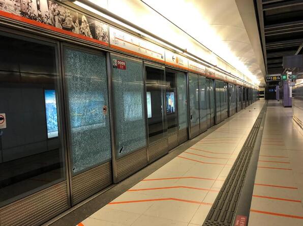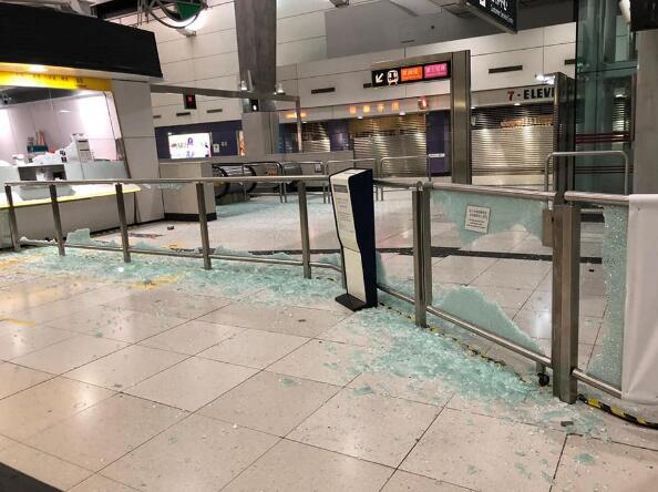 多次被暴徒針對破壞的港鐵東涌站,月台幕門昨晚在車站關閉後遭全部打爆,客務中心玻璃毀爛,站內其他設施,如大堂玻璃和售票機等也受破壞。