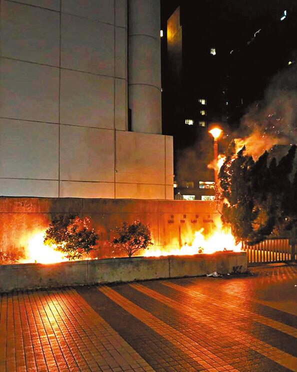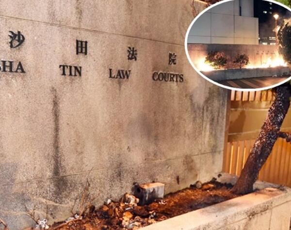 昨晚9時許,一批在沙田區聚集堵路的暴徒,突然向沙田法院大樓發動攻擊,在門外及外牆處投擲多枚汽油彈,花槽中彈後,約兩米高的大樹起火,一時間火光熊熊,現場遺下一個載懷疑易燃液體的鐵罐。