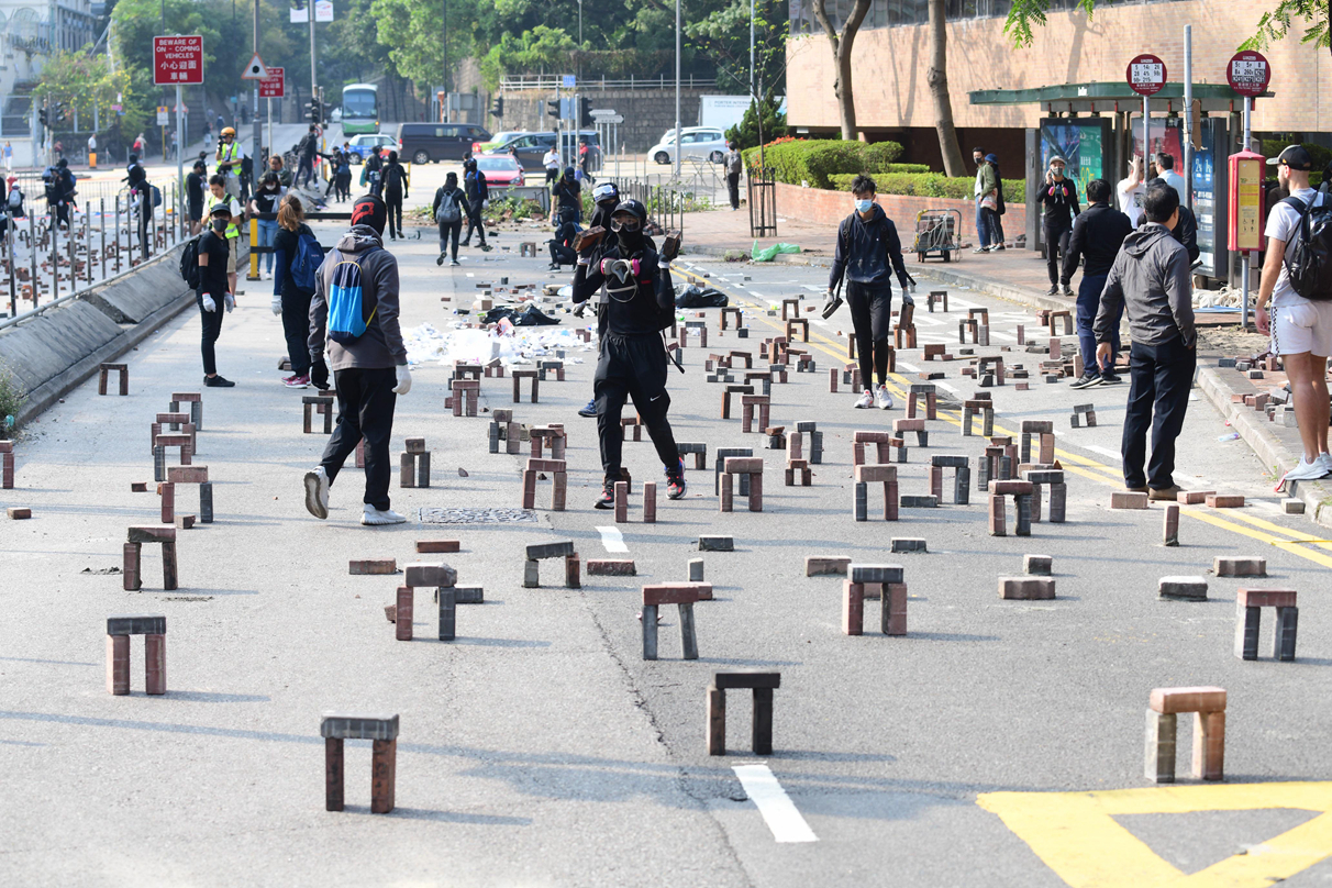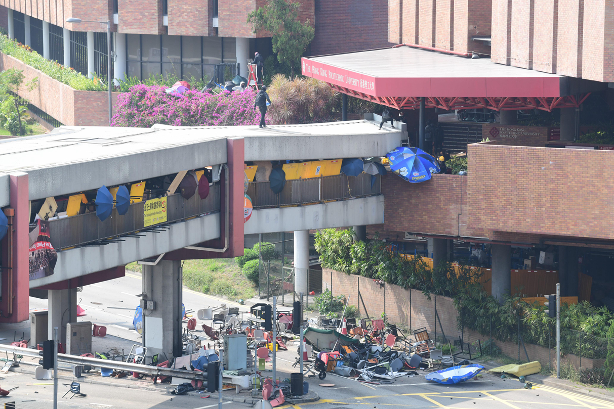 昨日,多區繼續有人堵路,交通受阻。紅隧設施周三晚被破壞後,昨早繼續封閉,過海交通受阻。昨早6時許,紅隧九龍入口往香港方向近理工大學位置,連接理工大學與紅磡站天橋被黑衣暴徒霸佔,並向橋下投擲雜物,阻礙車輛駛過。路面則被放置了大批雜物,隧道收費亭有被燒過的痕迹,玻璃窗碎裂。有人用雨傘及鐵欄等封鎖多條路面通往理工大學天橋的樓梯,多名黑衣人在天橋及大學內視察路面情況。