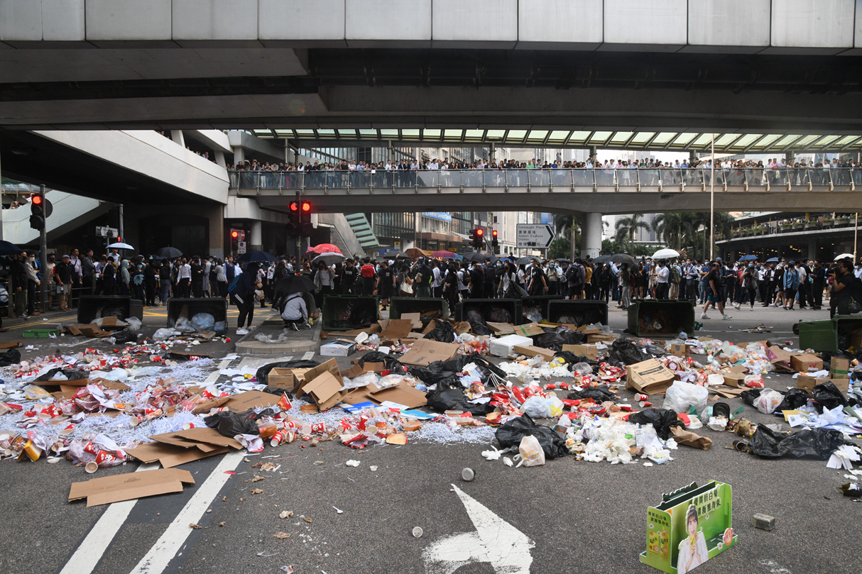午後再有人在中環堵路,數百人繼續沿干諾道中向上環方向進發,並以垃圾桶、磚頭,以及雪糕筒等堵塞干諾道中行車隧道。干諾道中黑衣人拆開垃圾袋,並將垃圾倒出作路障,現場滿布食物殘渣、廢紙等。太古亦有過百人以膠欄、雪糕筒、磚頭等阻塞英皇道。