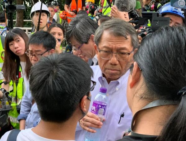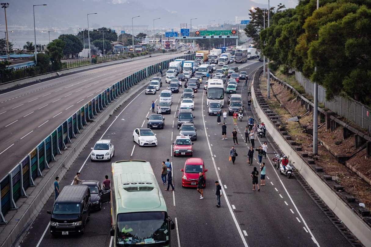 黑衣人癱瘓吐露港公路交通,有駕駛者及車上乘客沿公路步行離開。中通社