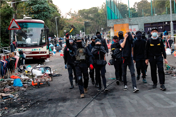 中大校園內黑衣暴徒遊走,警方指斥校園成為暴徒「兵工廠」及「武器庫」。路透社