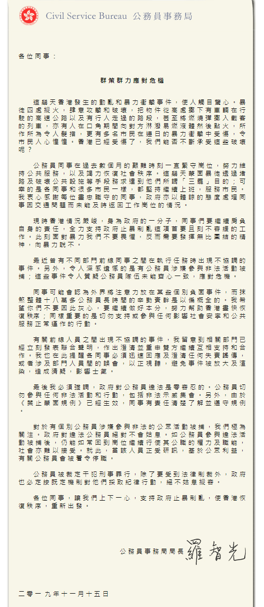 羅智光首先於信中表示,這幾天香港發生的動亂和暴力衝擊事件,使人觸目驚心,稱「暴徒」四處縱火,肆意攻擊和破壞,甚至將燃燒彈擲入載客列車中,形容有關行為令人髮指,令市民人心惶惶,反問目前香港已受傷了,公務員又能否不斷承受這些破壞。