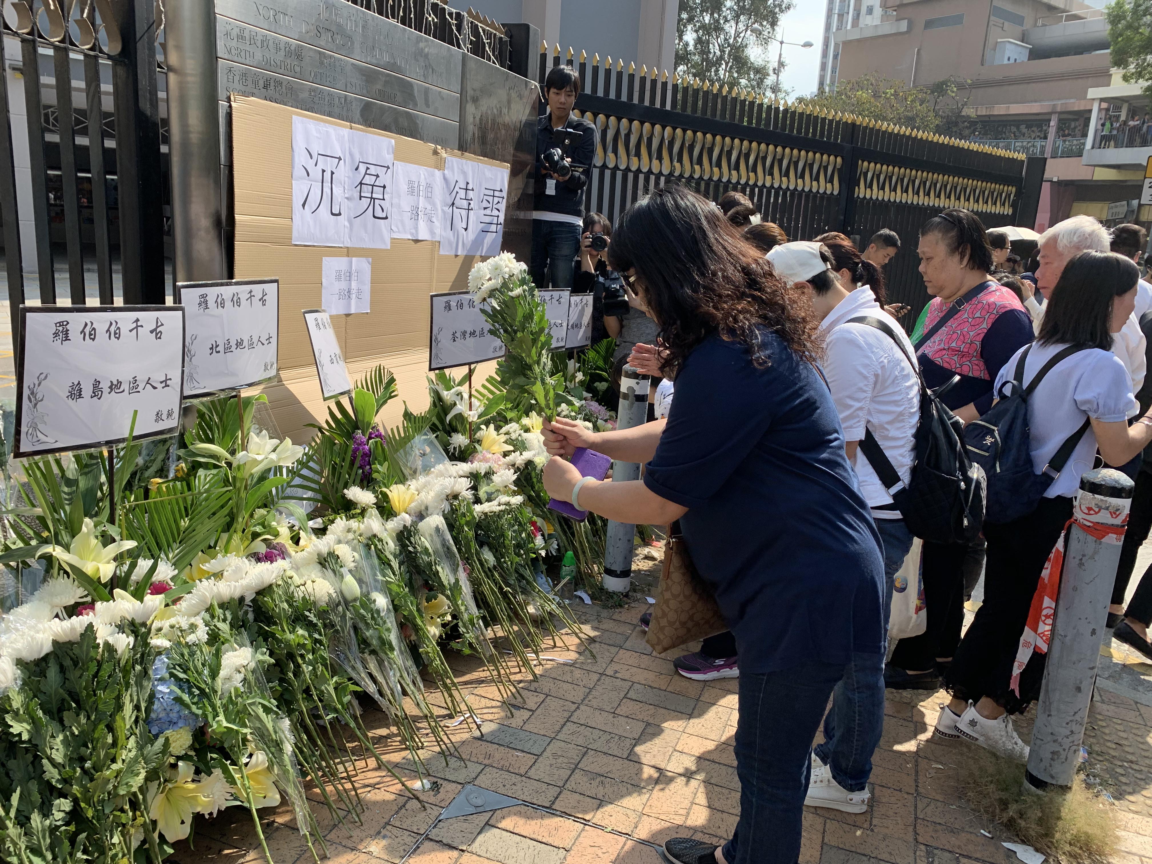 一群市民自發來到上水北區大會堂附近擺放鮮花,悼念被暴徒掟磚殺害的清潔工人羅老伯。記者 區天海攝