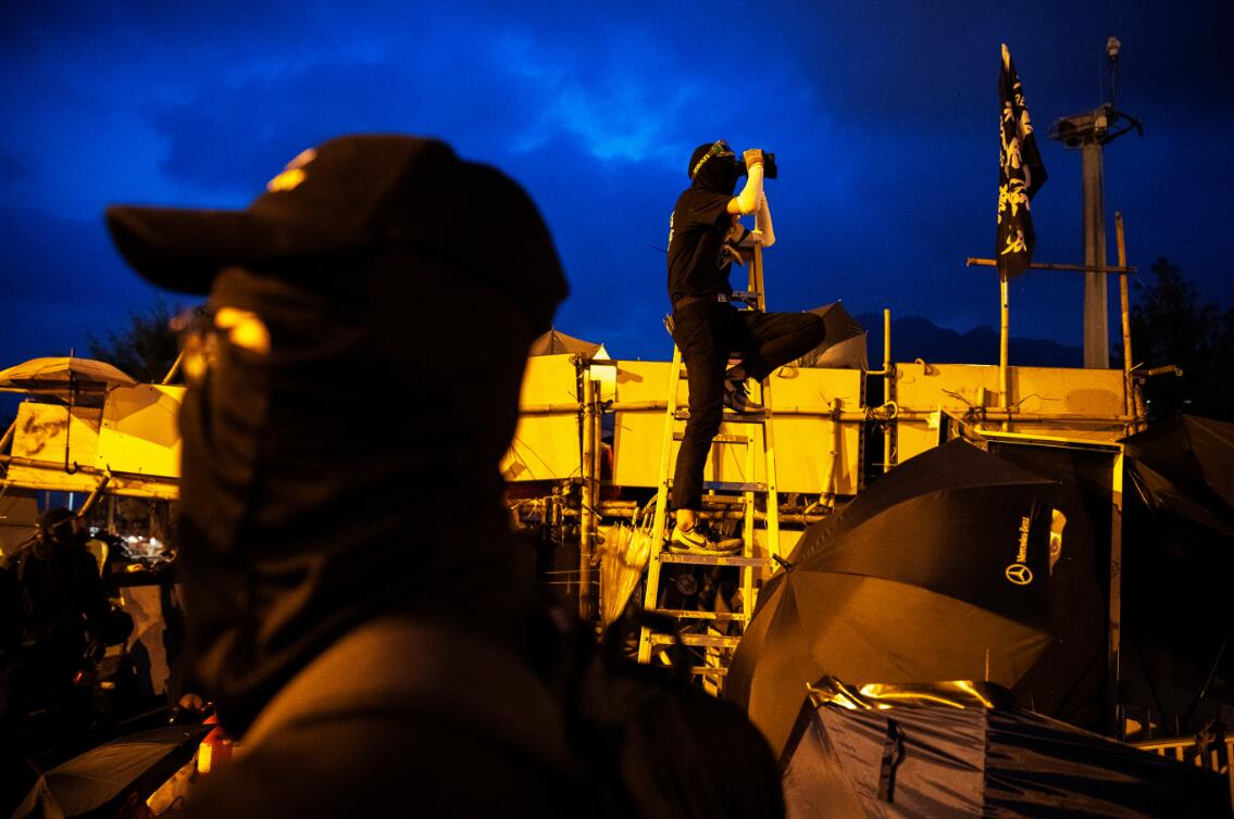 中大校園日前被暴徒佔據,有人在2號橋上搭起瞭 望台觀察警方行動。