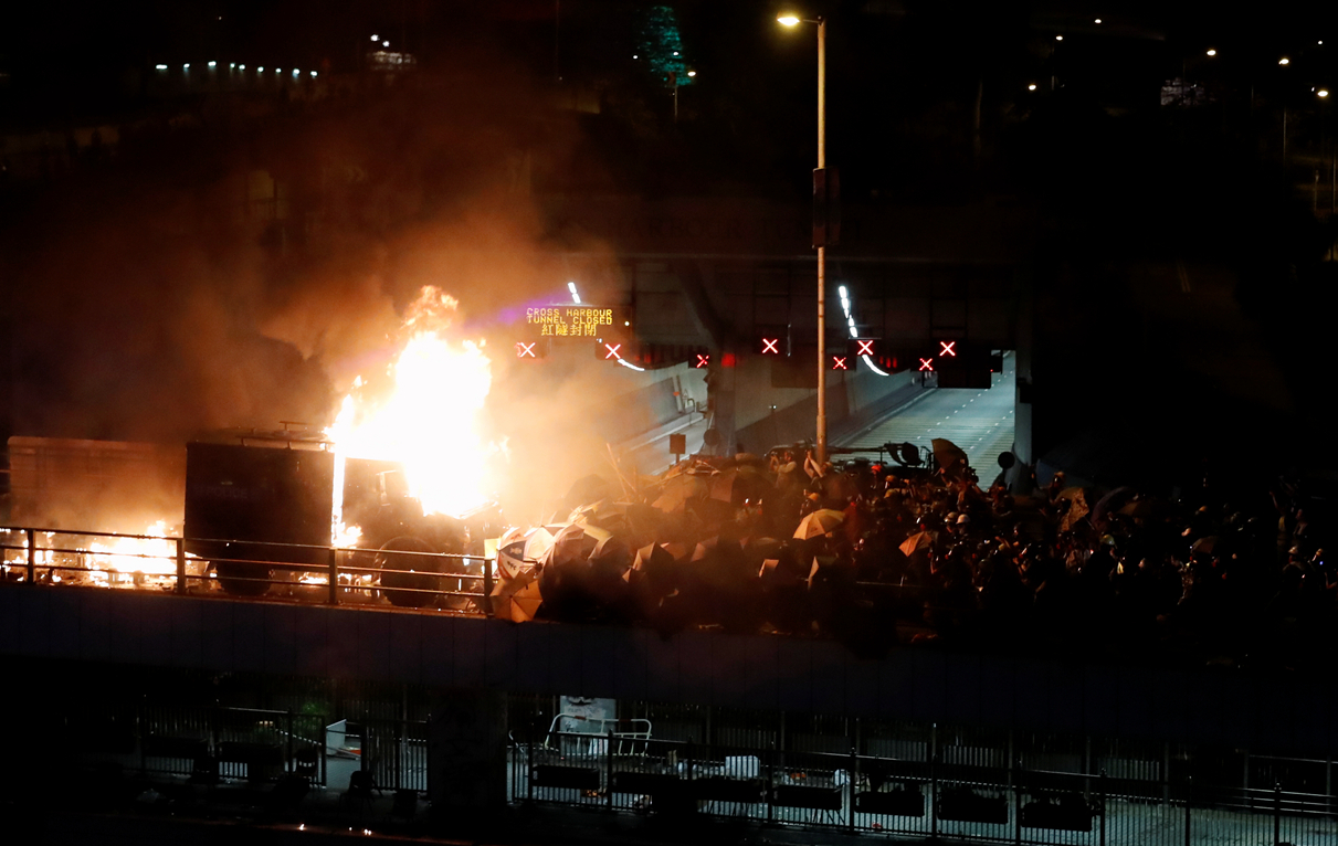 昨晚,暴徒在紅隧外的暢運道天橋投擲汽油彈焚燒裝甲車。路透社