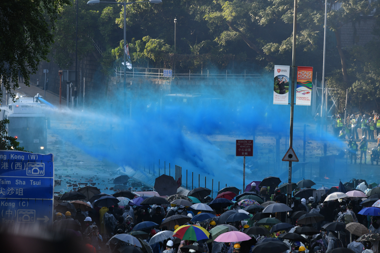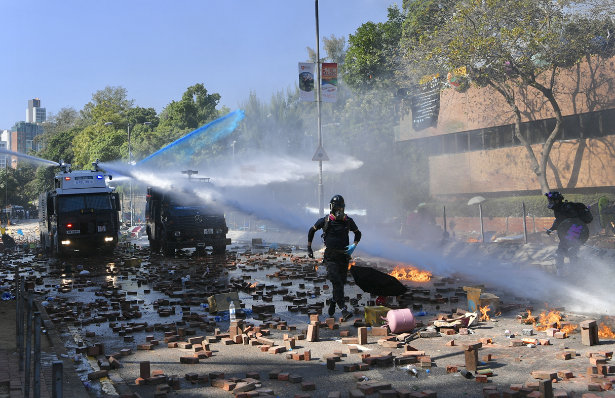 下午1時45分,警方2輛水炮車和2輛銳武裝甲車沿暢運道推進及噴射藍色水柱,理大紅色外牆被染藍,黑衣人舉傘遮擋。大隊防暴警尾隨水炮車推進,舉橙旗及廣播警告,現場煙霧迷漫無法視物。