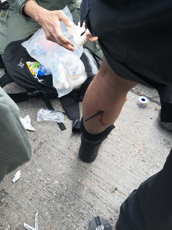混戰期間,下午2時許,警方一名傳媒聯絡隊警長在漆咸道南被利箭射中左小腿,同行馬上營救,將箭矢先折斷一段。救護員趕到急救,傷口直徑近2厘米,警長送院接受手術。受傷警長於下午5時許完成手術,取出箭頭,雖無傷到筋骨,惟情況嚴重。
