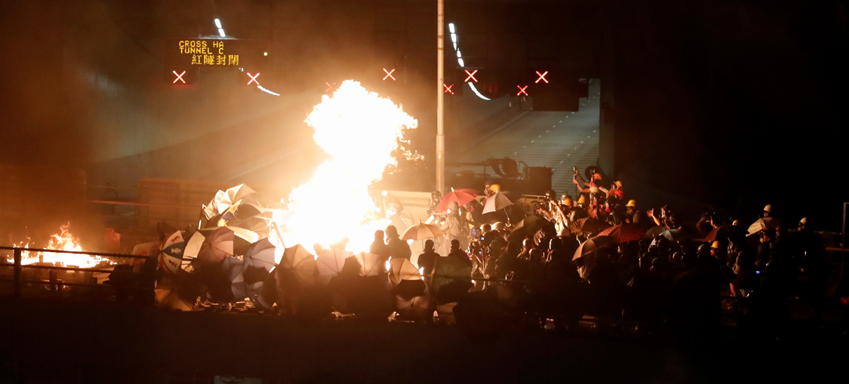 昨午5時後,暴徒轉戰紅隧外天橋。他們集結在暢運道天橋築起路障,投擲大批汽油彈阻止裝甲車接近,橋上火勢異常猛烈。入夜,熊熊烈火映照半空,一片通紅。