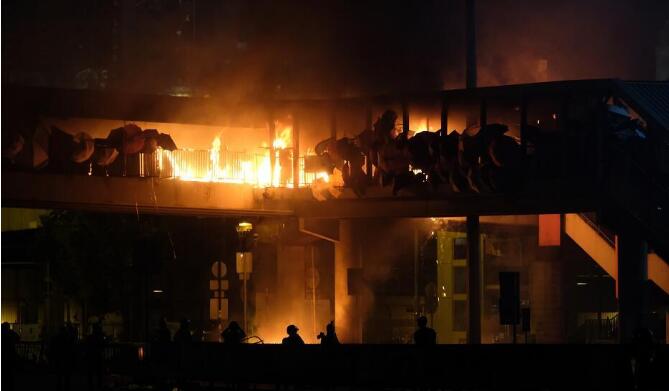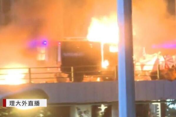 据多家港媒报道,当时,一群黑衣暴徒向警方的两辆锐武装甲车疯狂投掷汽油弹,意图阻挡警方前进。随后,其中一辆装甲车遭多枚汽油弹击中起火,警方后撤并密集发射催泪弹。
