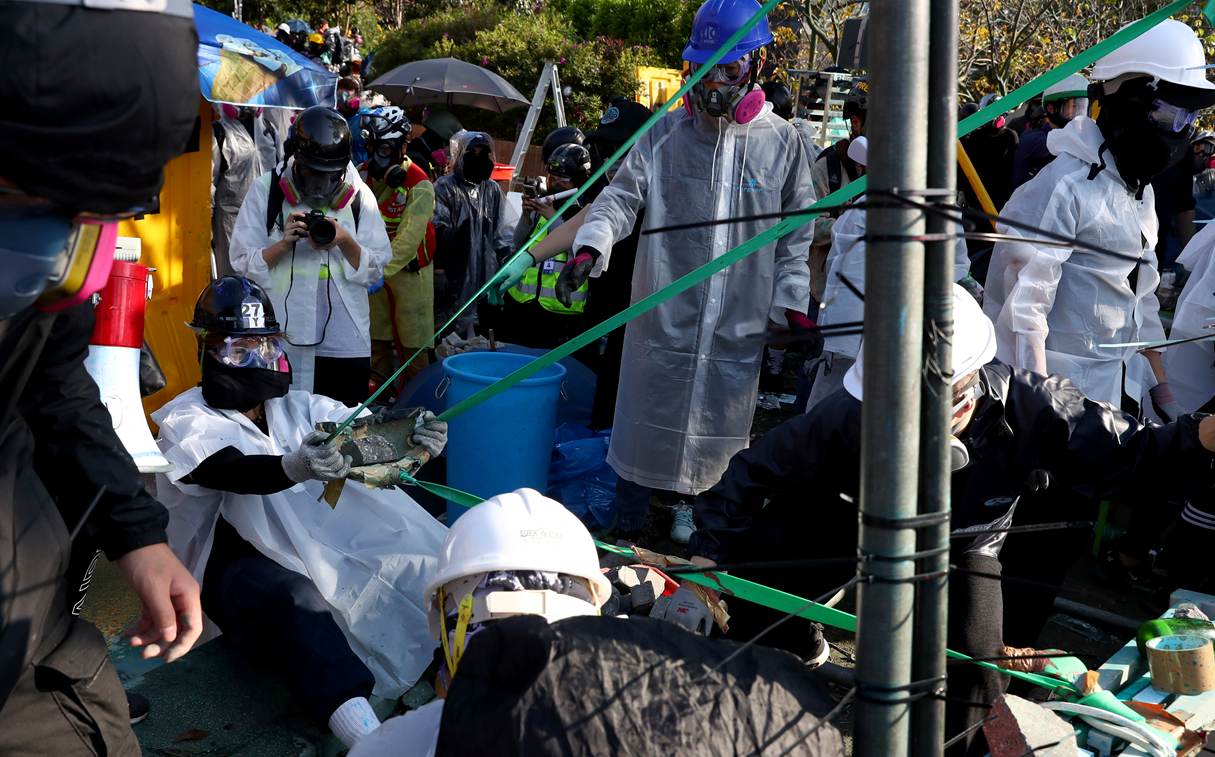 警方與暴徒相持半夜後,至昨晨10時許,有幾十名市民自發到柯士甸道近漆咸道南交界清理路障。理大內黑衣人發現後,竟用擴音器廣播:「呢個係理工大學的學生呼籲,如果你哋再拆路障,我哋將會用最低武力將你哋驅散!」之後,向市民方向掟出一批汽油彈。市民見狀走到柯士甸道暫避,大批防暴警察到場列陣,黑衣人亦跑到近校園門外布陣,雙方互射催淚彈和汽油彈。
