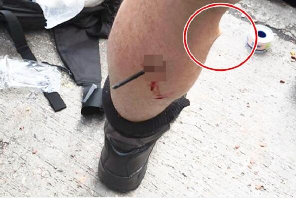 一名協助記者採訪的傳媒聯絡隊警長,昨午約2時在漆咸道南和柯士甸路交界近九龍玫瑰堂位置,被弓箭射中左小腿,金屬箭頭從小腿背後插入,幾乎貫穿。受傷警員其後被送廣華醫院,接受手術取出箭頭,警察公共關係科總警司謝振中昨午也曾前往探望。