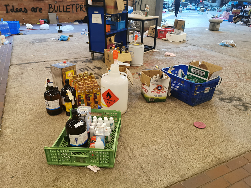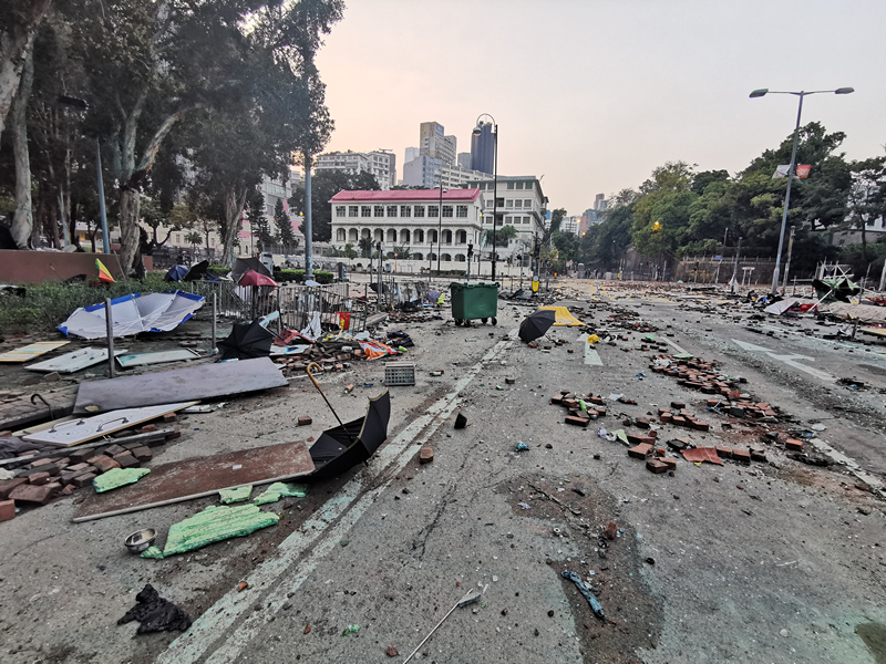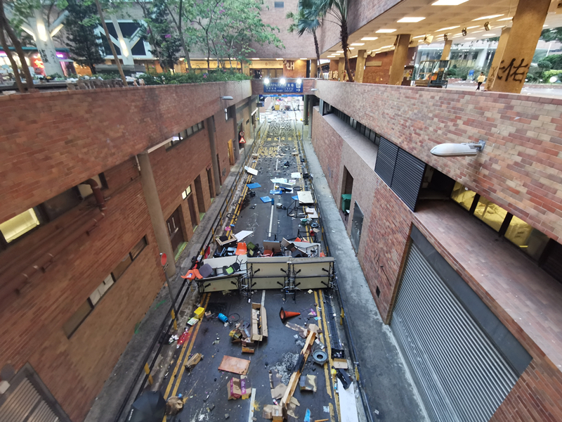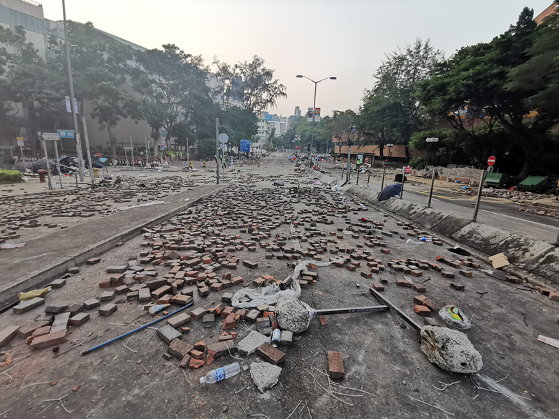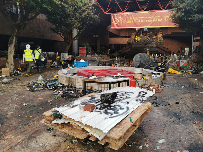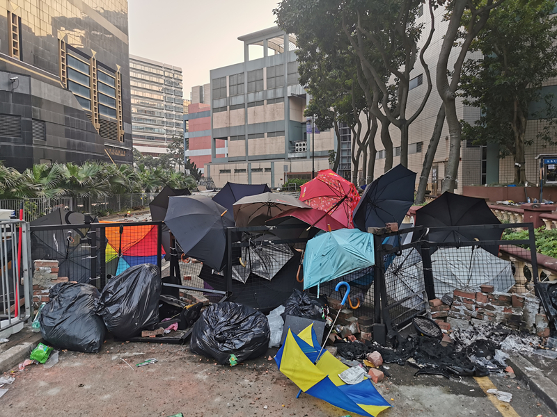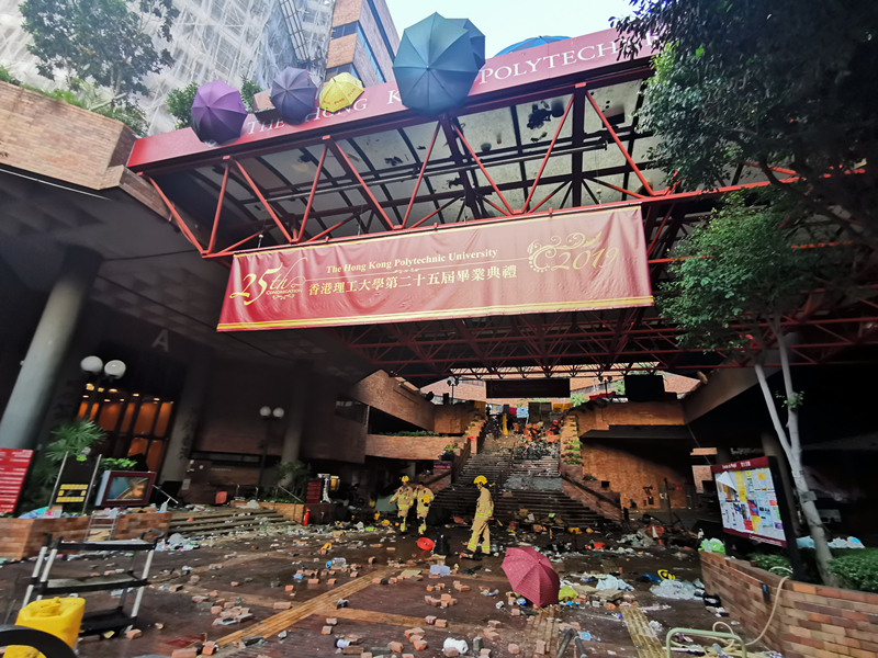 理大校園經過這一來一回的蹂躪,已成一片廢墟,滿地磚頭,燒毀的雜物,破壞的道路完全看不到原來的面目,用磚頭水泥築起的路障仍牢固而核突地聳立在大門口的樓梯上,校內隨處可見大量的汽油彈。消防員在現場撲滅火頭。戰後餘生,在夕滿下滿目蒼夷,有點像被战争洗礼过的叙利亚大马士革,远远看过去,只見慶祝廿五屆畢業禮的錦旗仍新簇簇地在廢墟上飄掦。