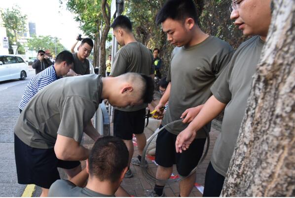解放軍駐港部隊部分人員日前在九龍塘協助清理路障。林鄭表示,解放軍駐港部隊到九龍塘軍營外清理路障,並非由特區政府提出。