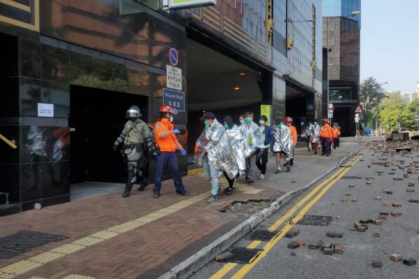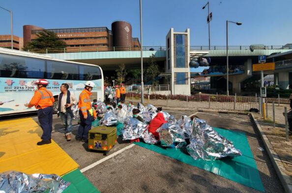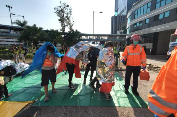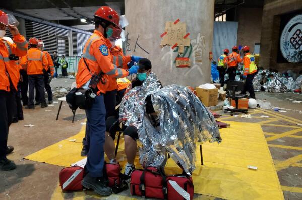 救援人員在理大對開,紅磡一處停車場作為臨時救護站,受傷的學生被安排坐在地墊上,披上毛墊及錫紙包裹身體,等候送院。消息指,大部分傷者都出現低溫症徵狀、擦傷及扭傷。其後陸續獲按排由多輛救護車分送到多間醫院。