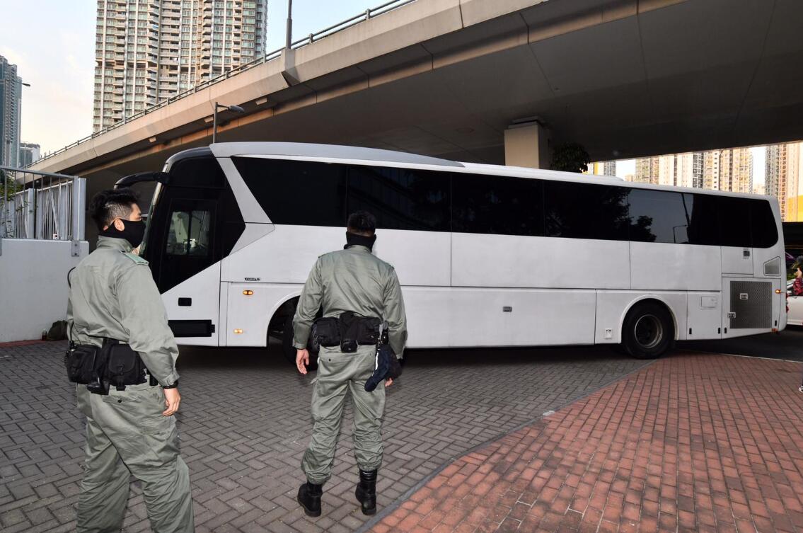 80人被控彌敦道暴動分成4案處理,被告昨日由警方安排大巴押到法庭。