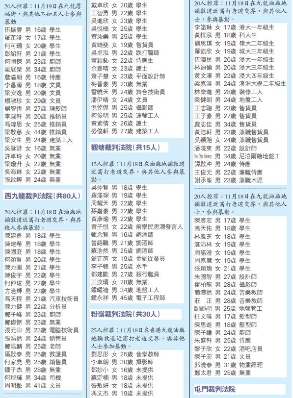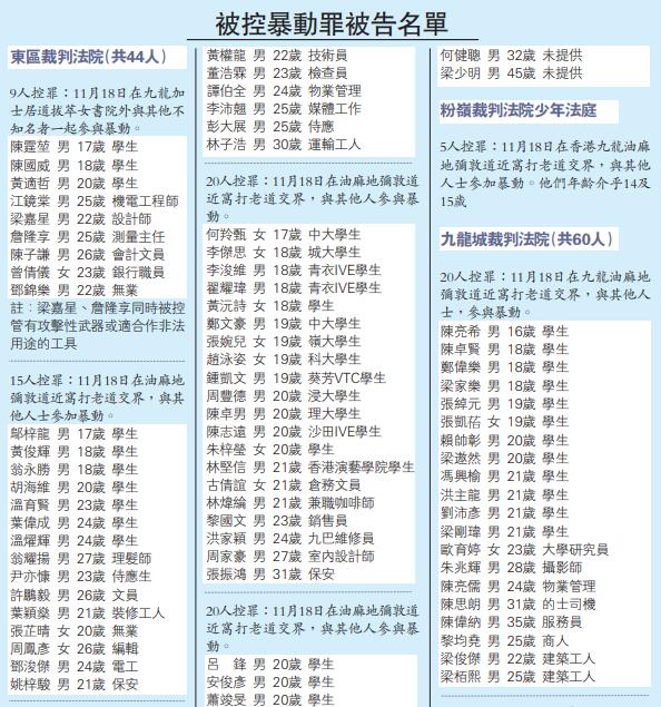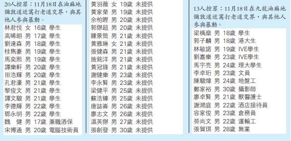 翟堂瑋(18歲)、陳卓男(20歲)、陳志遠(20歲)、鄭文豪(19歲)、張振鴻(31歲)、張婉兒(19歲)、趙泳姿(19歲)、周豐德(20歲)、周家豪(27歲)、朱梓瑩(20歲)、鍾凱文(19歲)、古倩誼(21歲)、何羚甄(17歲)、黃沅詩(18歲)、洪家穎(24歲)、黎國文(23歲)、林堅信(21歲)、林煒綸(21歲)、李傑思(18歲)、李浚維(18歲),同被控於本年11月18日在九龍油麻地彌敦道近窩打老道交界,與其他人士參與暴動,當中有14人為學生。