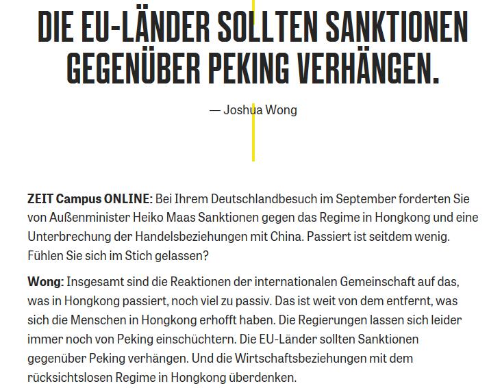 时代周报记者问他,你今年9月到访德国时,曾要求马斯外长制裁香港当局,中断与中国的贸易关系。迄今这种情况并没有怎么出现,你是不是觉得被冷落抛弃?黄之锋回答说:整体来看,国际社会对香港局势的反应还是太消极,与香港人所期望的结果相去甚远。很遗憾多国政府还是对北京心存忌惮。欧盟国家应该对北京进行制裁,重新考虑与香港当局的经济关系。