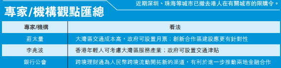 中大工商管理學院高級講師李兆波接受記者訪問時亦談到交通問題,他指出,很多香港年輕人沒有到大灣區參觀過,政府應該給予一些香港到大灣區的交通津貼,鼓勵年輕人到大灣區參觀,感受大灣區內地城市與香港距離並不是那麼遠。
