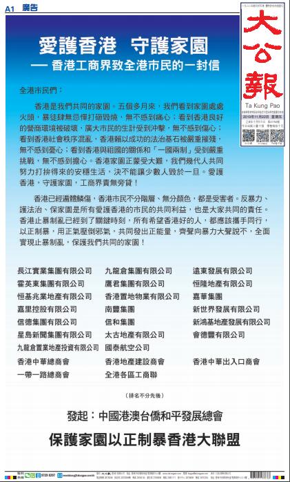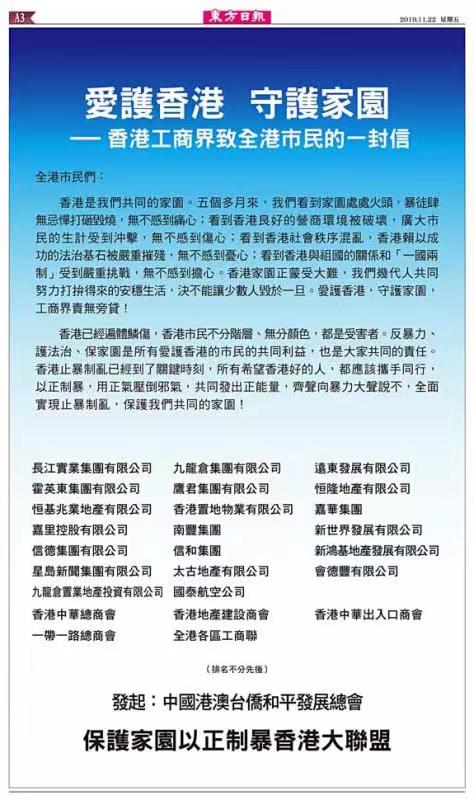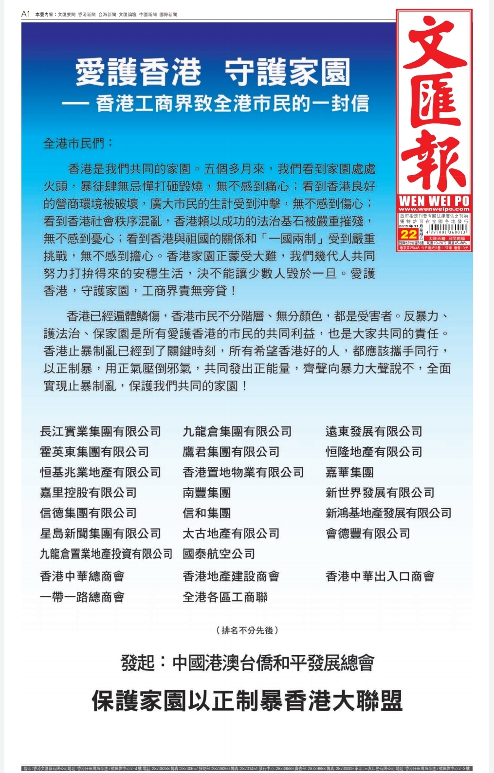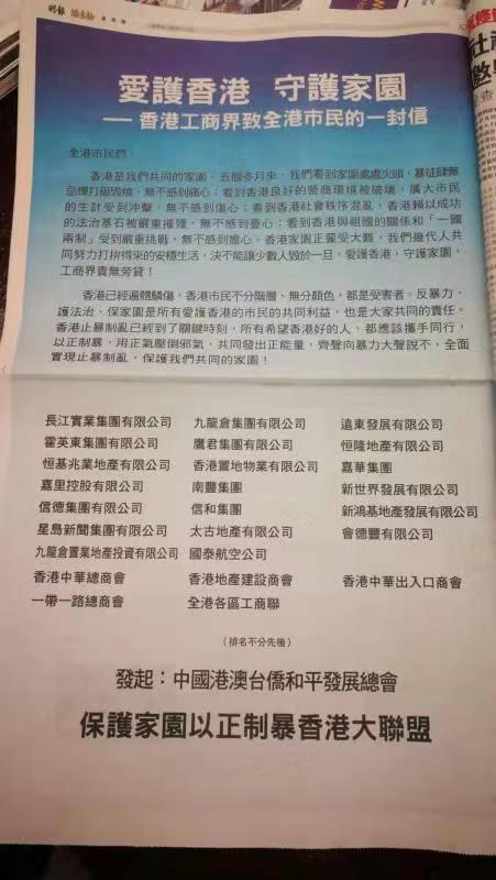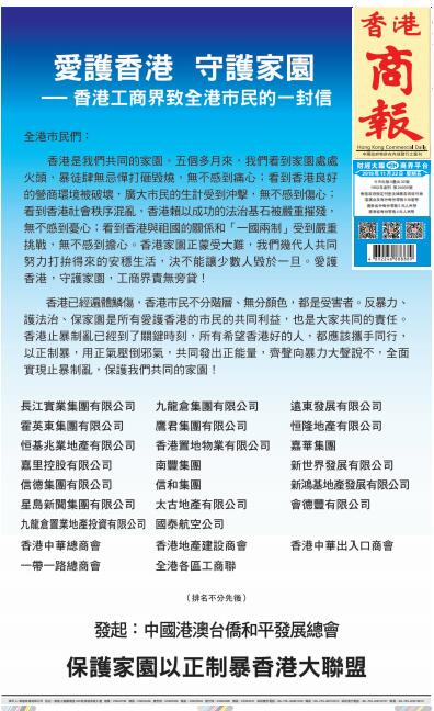 【香港商报网訊】包括长实、恒地、新鸿基、新世界等本港地产商在内的20間香港主要公司聯合5大商會今日(22日)在文匯報、大公报、香港商报、东方日报等报纸頭版向全港巿民發出公開信,指香港止暴制亂已經到了關鍵時刻,呼籲所有希望香港好的人,共同發出正能量,向暴力說不,全面實現止暴制亂,保護大家共同的家園。