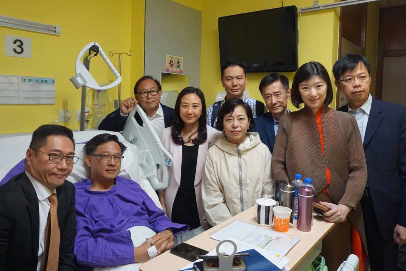 一班建制派議員到屯門醫院探望遇刺受傷的何君堯。