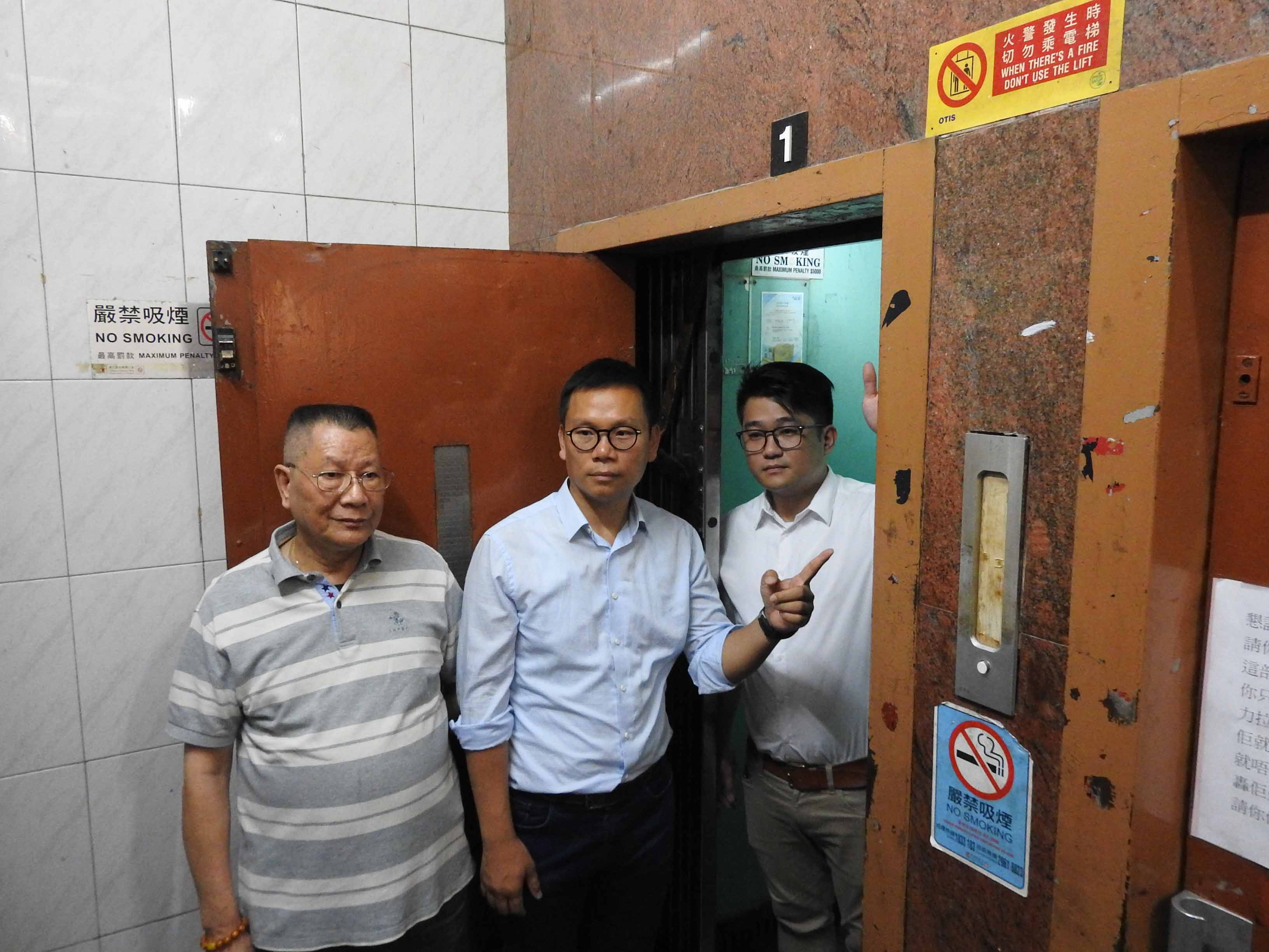 ▲陳恒鑌(中)與民建聯社區幹事伍俊瑜(右)合作無間,年前關注政府資助維修升降機問題,陳不競逐連任楊屋道選區,由 「徒弟」 伍俊瑜出選。