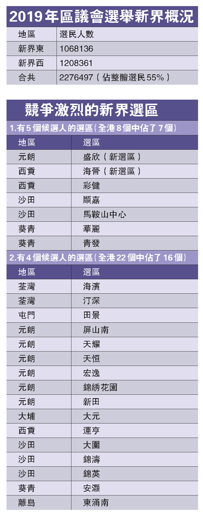 【香港商報网訊】記者戴合聲報道:今屆區議會選舉有超過413萬名登記選民,創歷年新高,新界幅員廣闊,新界東、新界西是全港選民最多的地區,共佔整體55%。今次選舉會產生452位區議員,新界佔了逾半的237席位。今次選舉全部選區都有競爭,沒有「自動當選」議員,不少立法會、區議會雙料議員都扎根新界,如民建聯周浩鼎、工聯會麥美娟等。全港最激烈的選區都集中在新界,當中「5人爭1席」的8個選區,新界佔了7個。是次選舉正值修例風波,發生刺傷候選人何君堯等暴力事件,社會各界人士都希望選舉能順利進行,冀望選民用選票支持建設力量。