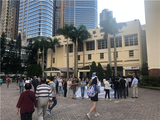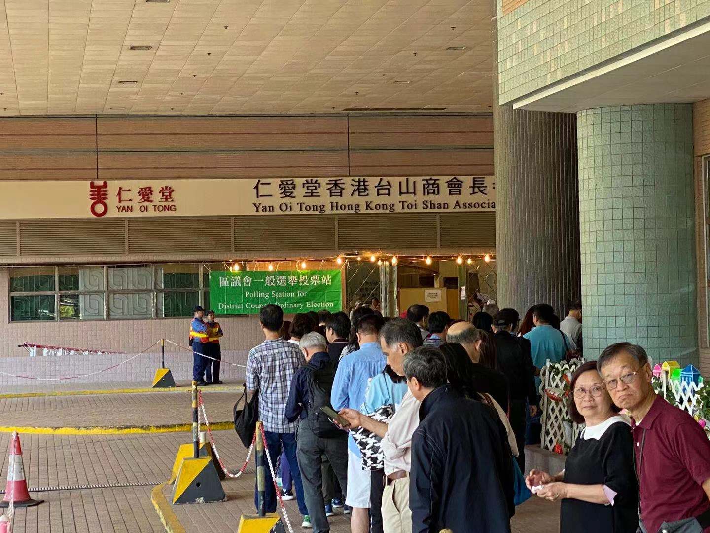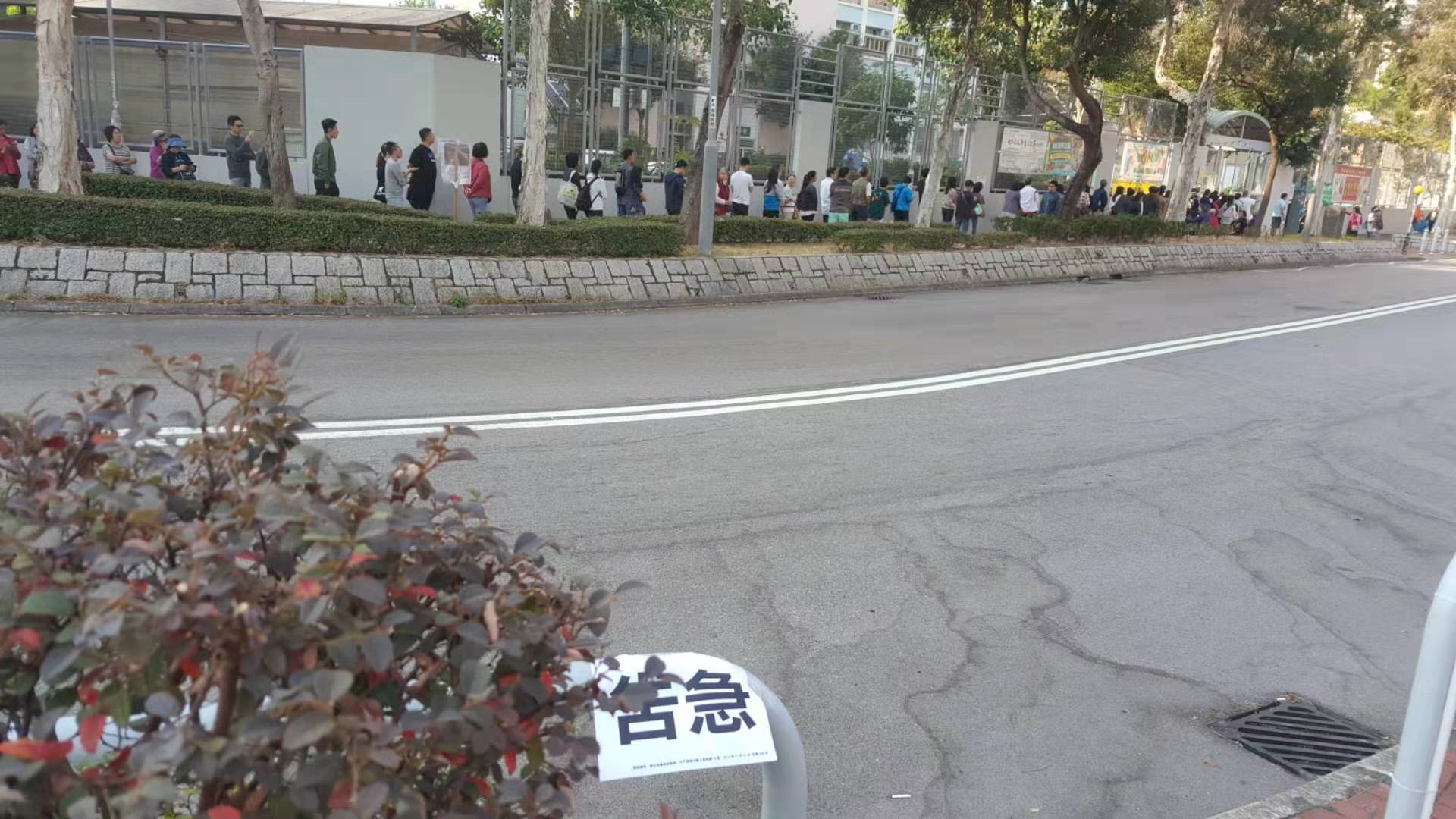 【08:40】區議會一般選舉今天投票,早上八時多,有投票站已出現人龍,在屯門兆翠選區深培中學門外,已有百多二百人排隊,有候選更打出告急牌。