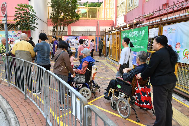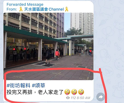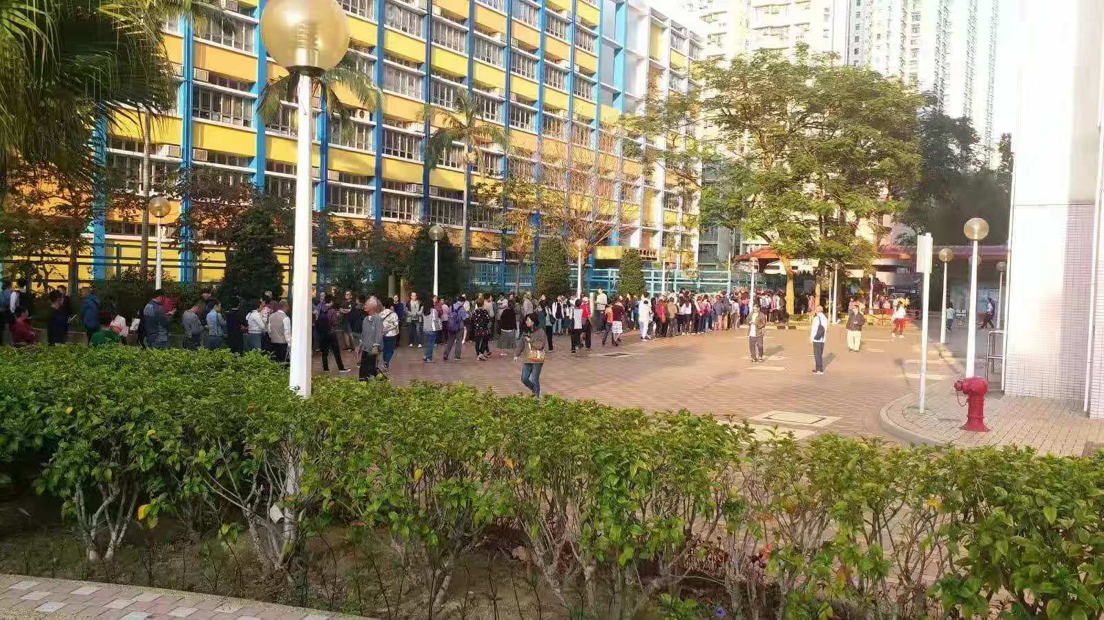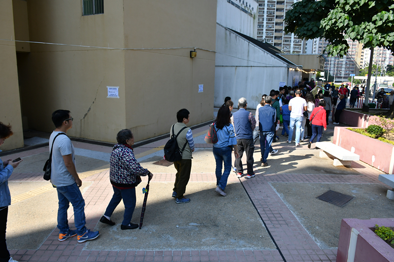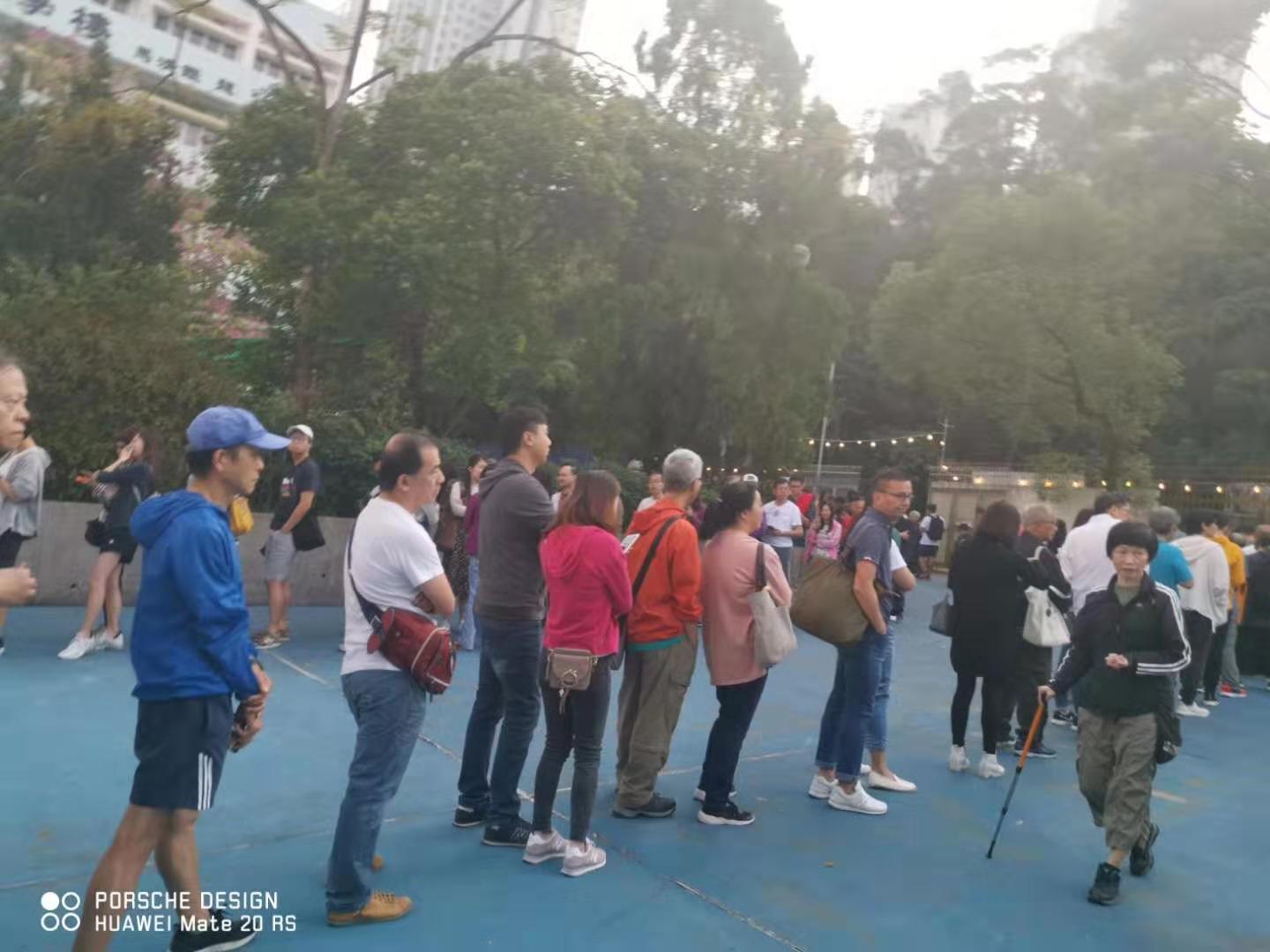 【10:40】上午10時40分,网传反对派为阻挠区选投票,有人投完票后回到队尾重复排队,恶意增加长者轮候时间,企图令部分不能久站的老人却步。另传有长者于观塘玛利诺书院校友会票站投票时,被要求出示投票通知书,长者以为有需要便返回家拿取并重新排队。有市民见恶意扰乱投票秩序的行为,已经报警处理。