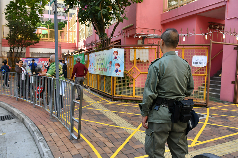 【10:50】乐华村一早已有过百人排队投票,当中不少是老人家和伤残人士,负责人核实后让他们先入去投票。为防止票站受到干扰,站内外都有警员看守。(冯瀚文摄)