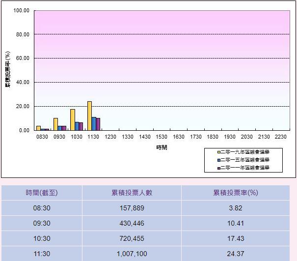 【12:11】區議會選舉截至早上11時半,投票人數突破百萬,累積投票人數100萬7100人,累積投票率為24.37%;較上屆區選增加13.48百分點。