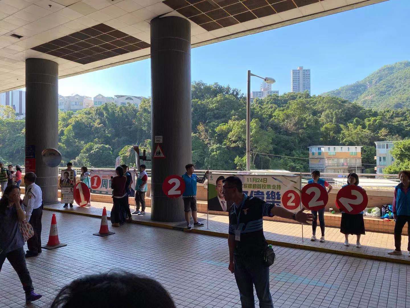 【14:30】沙田骏马选区因香港中文大学遭到破坏而被迫将票站地址迁至火炭骏景园,但仍无碍大批选民前来投票。下午14:30分左右,现场仍有约四五百位选民排队等候投票,有票站工作人员协助进行分流。