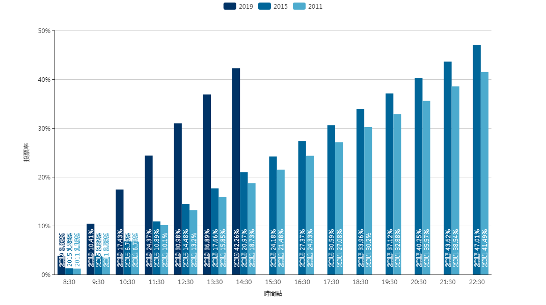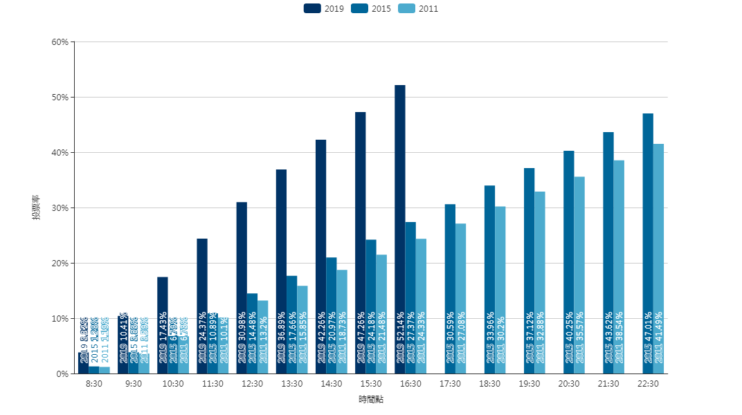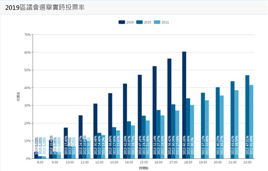 【16:40】今日投票截至15:30,累积投票率达47.26%,是2015年上届区选同一时间段24.18%近两倍!目前投票率,已超越上届区选总投票率的47.01%;投票人数已达1,953,121人,远超上届同一时间段投票人数754,705人,也已超越上届22:30总投票人数1,467,229人。