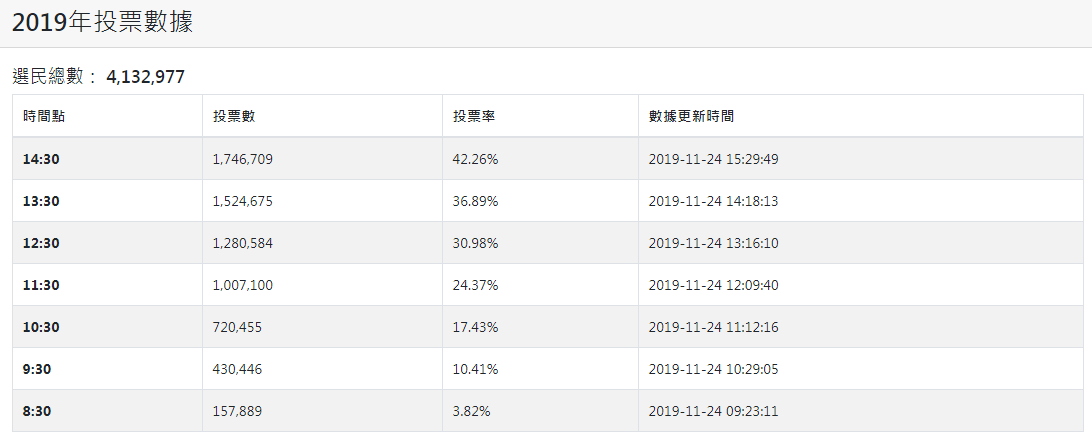 【15:30】截至14:30,香港区议会选举累积投票率为42.26%,累积投票人数为1,746,709人。 是2015年上届区选同一时间段投票率20.97%的两倍!