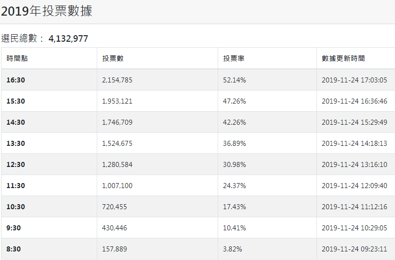 【17:05】區議會選舉截至下午4時半的首9個小時,共有超過2,154,785人投了票,投票率52.14%。投票總人數及投票率在下午三點半已打破歷屆區議會選舉紀錄。分區方面,荃灣投票率最高有55.03%,九龍城及沙田的投票率亦超過五成四。