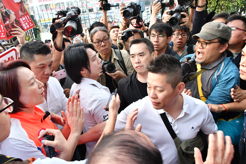 【17:24】李慧琼在土瓜湾海心公园见记者,被梁国雄(长毛)阻挠而腰斩,离开时一度被长毛阻碍。(冯瀚文摄)